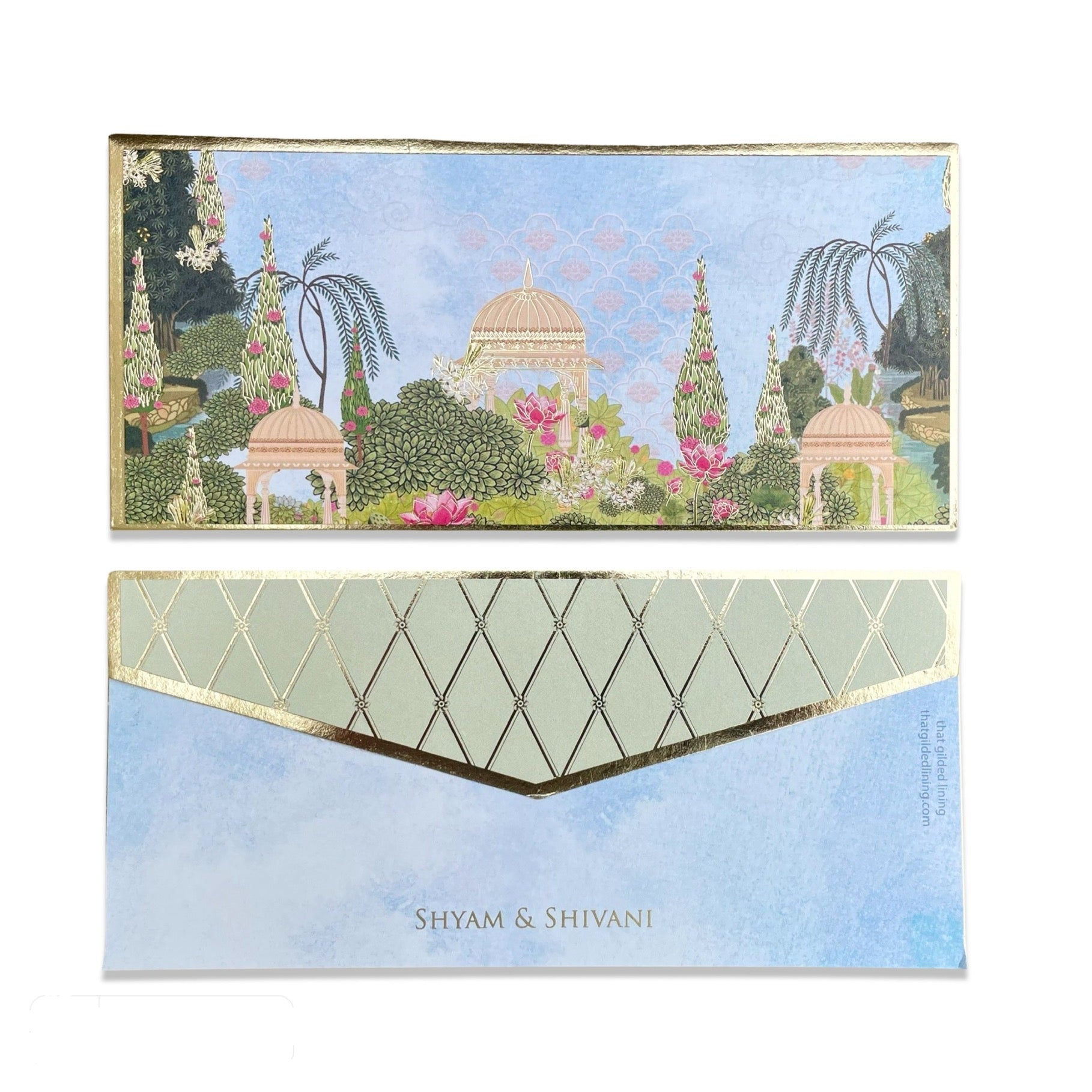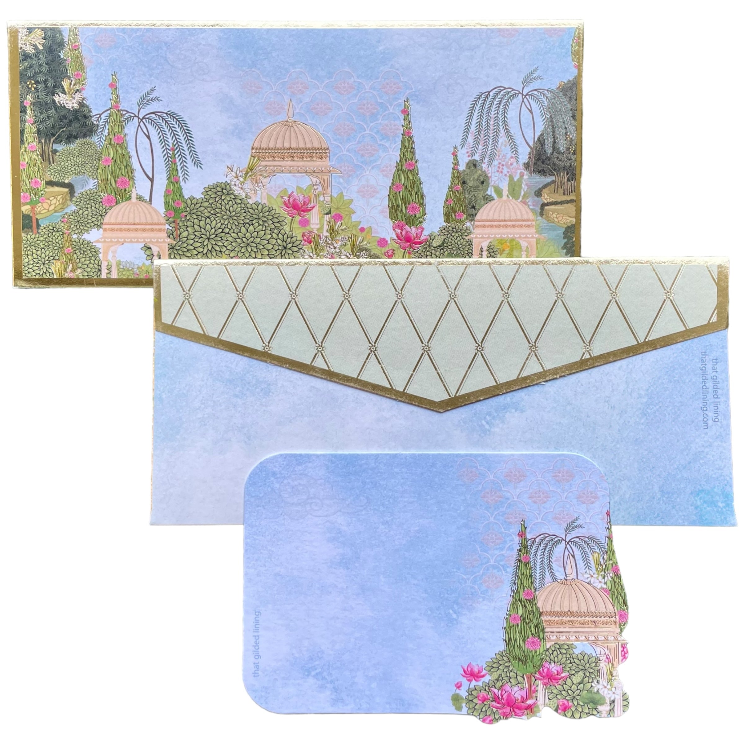 Beautiful blue skies, a lush Mughal garden and lots of delicate gold foil detailing- this collection redefines traditional sophistication. Perfect for those looking for something Modern Indian.